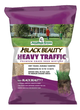 Jonathan Green’s Black Beauty Heavy Traffic Grass Seed contains our toughest and most durable turfgrass varieties. With an attractive, dark-green color and roots that grow up to 4-feet deep, this mix is perfect for backyards, sports fields, curb strips or anywhere aggressive foot traffic from athletes, children and pets occurs. This grass seed mixture excels on sports fields where uniform lawn texture is important, so soccer, football and baseballs bounce true. Black Beauty Heavy Traffic provides the wear tolerance and the uniform good looks that these athletic playing fields require. This seed germinates in 10-14 days.
