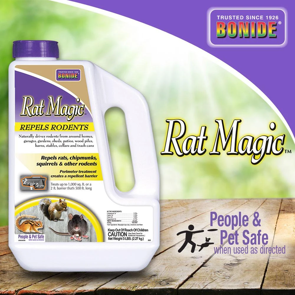 BONIDE Rat Magic�� granules repel rats, chipmunks, and squirrels from outdoor areas like garages, sheds, basements and more. Made with natural ingredients. Rat magic is people & pet safe, when used as directed.