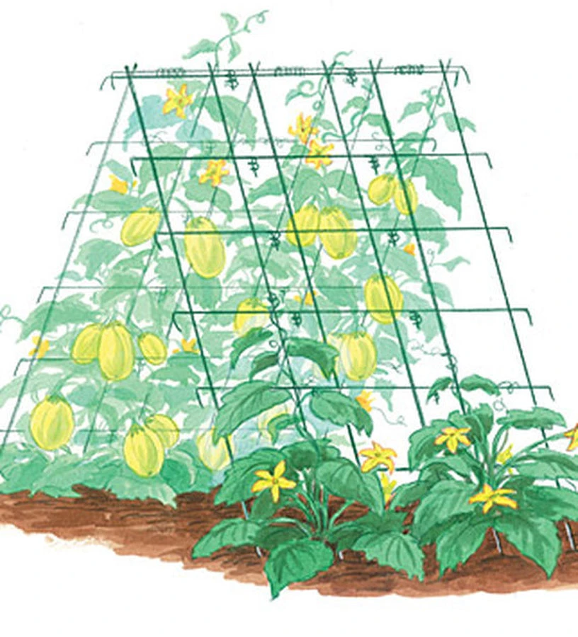 Cucumber and squash pyramid grows healthier plants with better fruits and makes harvesting a sinch. Growing plants off the ground reduce diseases, pests and increase the quality of the fruits.