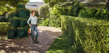 The most powerful hedge trimmer in the AK Homeowner’s system offers power and precision with a higher stroke rate, longer run time, and increased blade length over the previous HSA 56 model. Minimal vibration allows for operator comfort, and the rotating handle switches easily from side to top cutting for versatile performance. The double-sided, diamond-ground blades allow you to cut both directions with sharpness and resilience. When paired with the AK 10, the HSA 60 can run up to 60 minutes on a single charge.