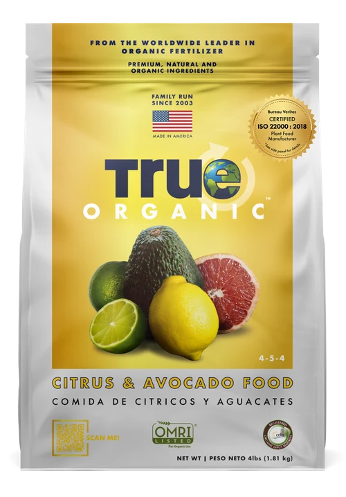 True Organicâą Citrus & Avocado Food contains 7% calcium to help prevent blossom end rot and is blended from natural & organic farm-grade ingredients used to make fertilizers for AmericaÊŒs organic produce growers. The ingredients are proven to be extremely beneficial for both plants and soil, including: